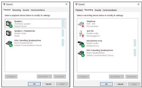 • When you plug in a Button, Windows should set ClickShare Speaker = Default device and Room Speakerphone = Default communications device.