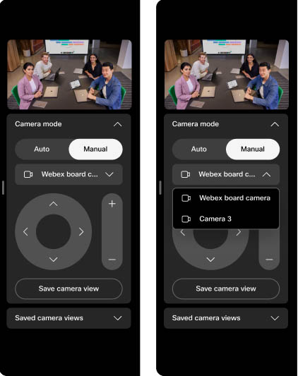 Manually control camera positioning or switch camera modes to fit your meeting needs.