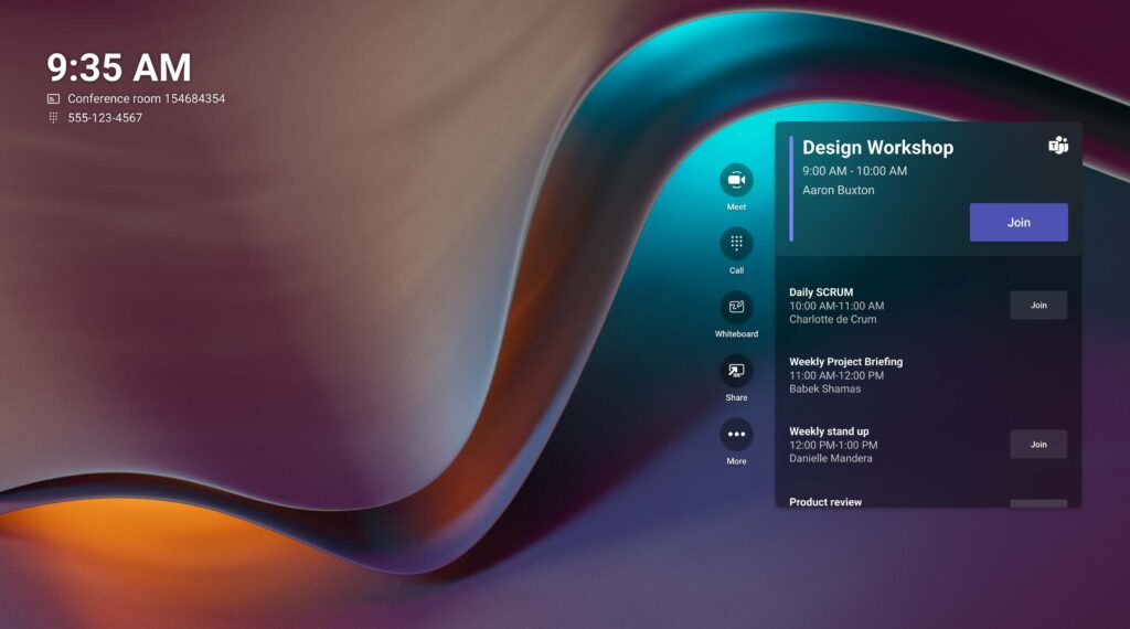 This is the main screen the Microsoft Teams Room will display while not in use. From here you can access many of the room’s features.