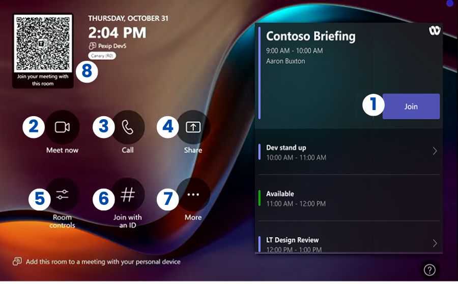 You might also want to join the meeting from your own device to share content or view participants on your device while content is shown on the room display.