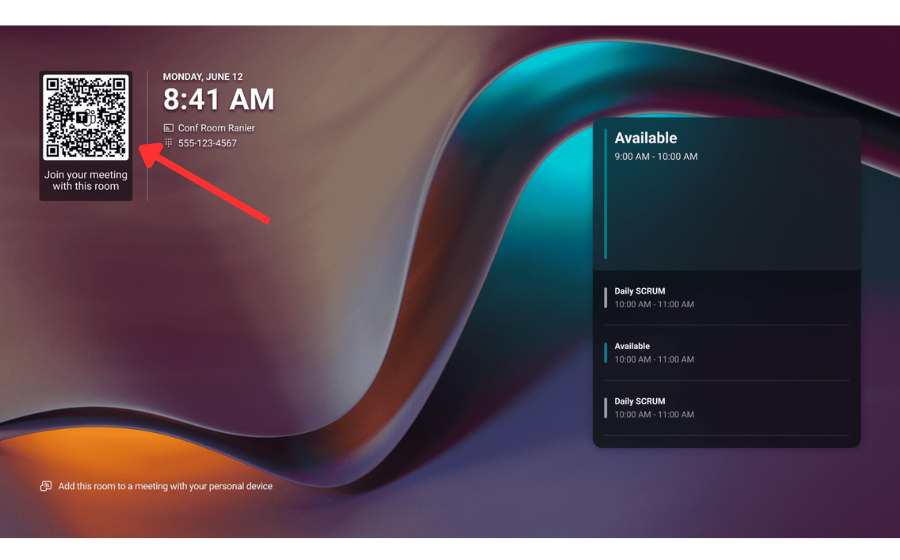 Microsoft Teams Rooms on both Windows and Android support a fast, wireless way to bring your meeting to the room using the QR code displayed on the home screen. This eliminates the need for Bluetooth pairing or plugging in your device, making it easier to connect on the fly.