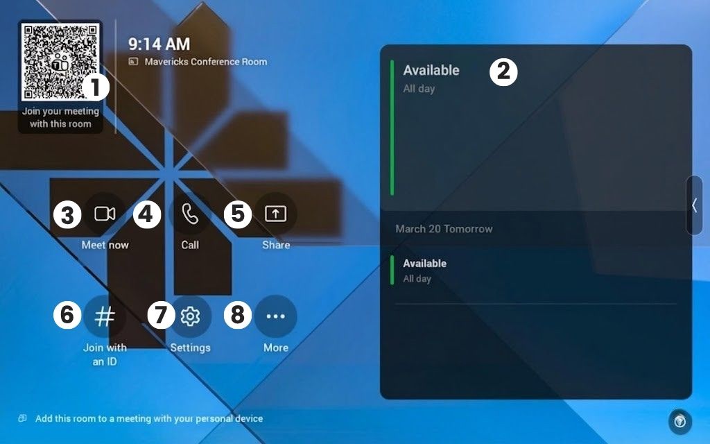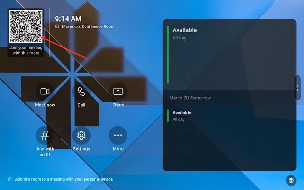 Microsoft Teams Rooms on both Windows and Android support a fast, wireless way to bring your meeting to the room using the QR code displayed on the home screen. This eliminates the need for Bluetooth pairing or plugging in your device, making it easier to connect on the fly.