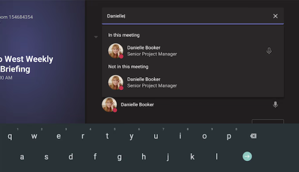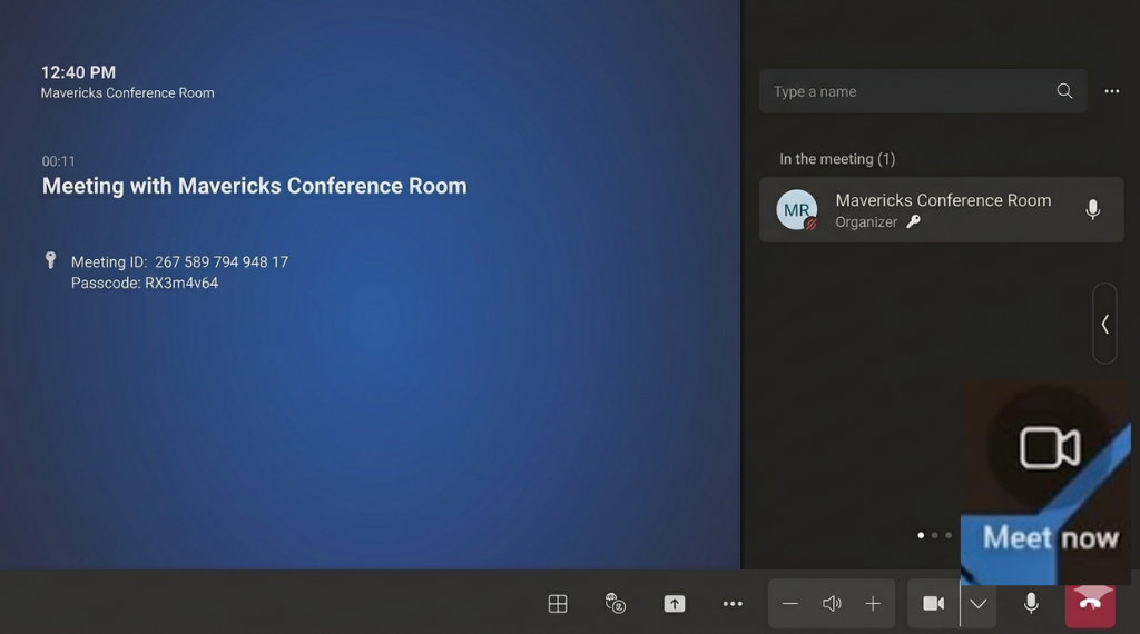 When you want to use the system for a new, unscheduled meeting, the “Meet” button allows you to create a new Teams meeting from the Microsoft Teams Room system and invite people to it by searching a name or number in the text field.