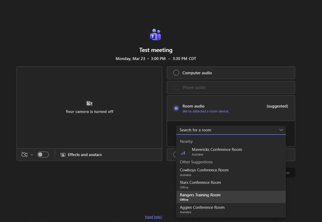 If you need to use the room’s speakers and microphones, select Room Audio instead.